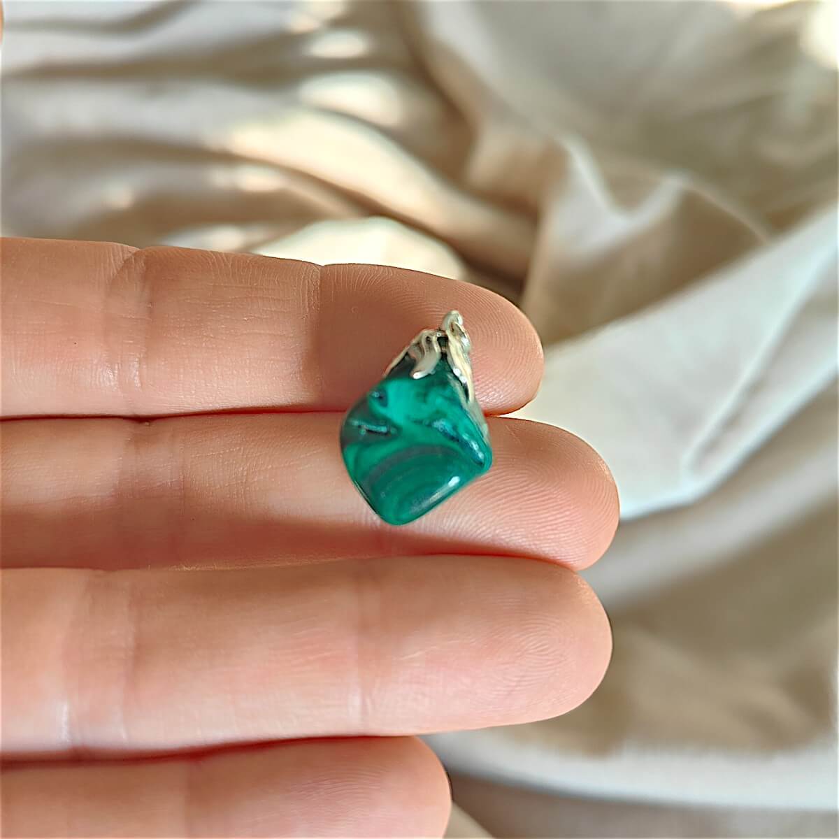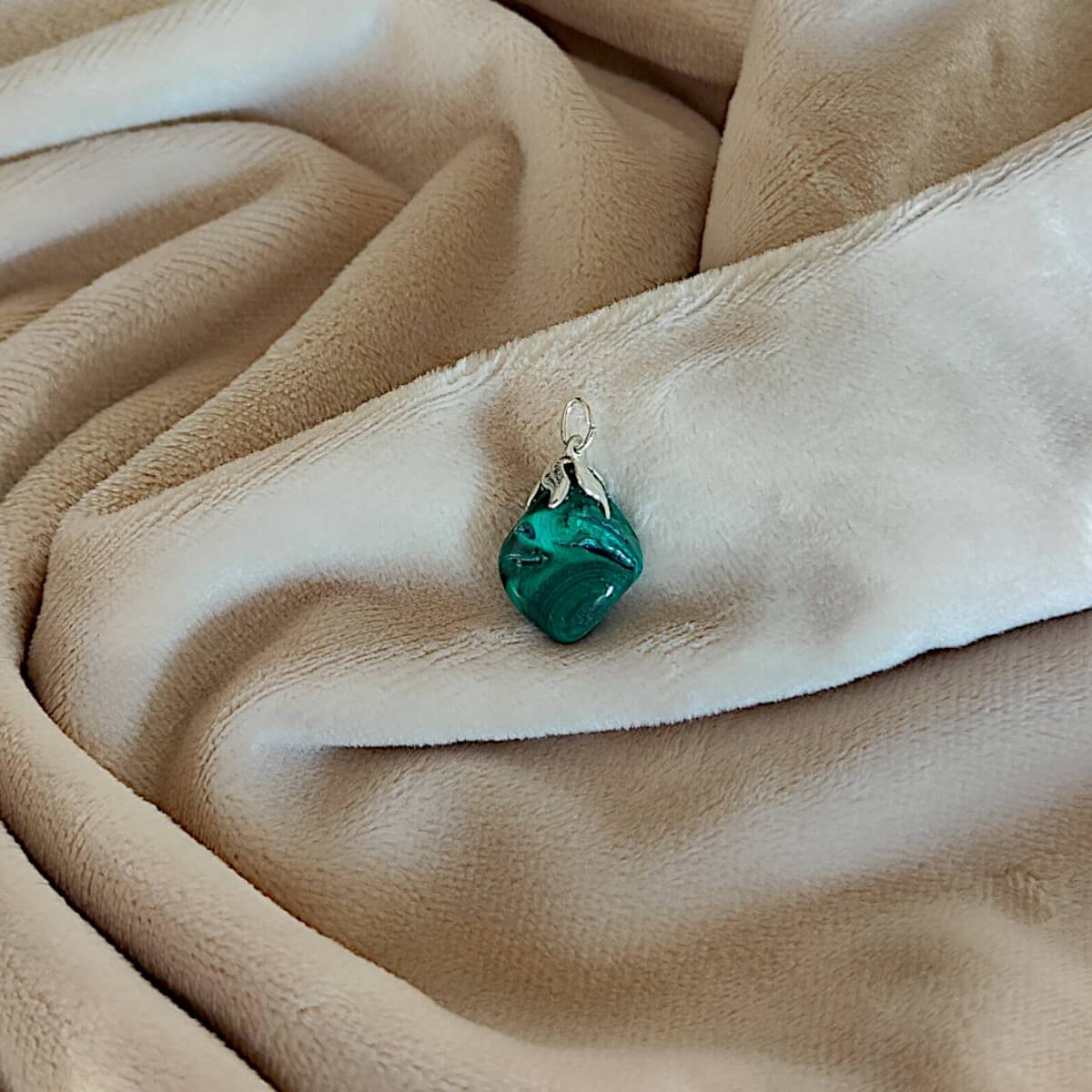 Wisiorek z naturalnego malachitu klasy A o wymiarach 1,5 – 3 cm, z mosiężnym oczkiem – kamień transformacji, ochrony i uzdrowienia emocjonalnego.