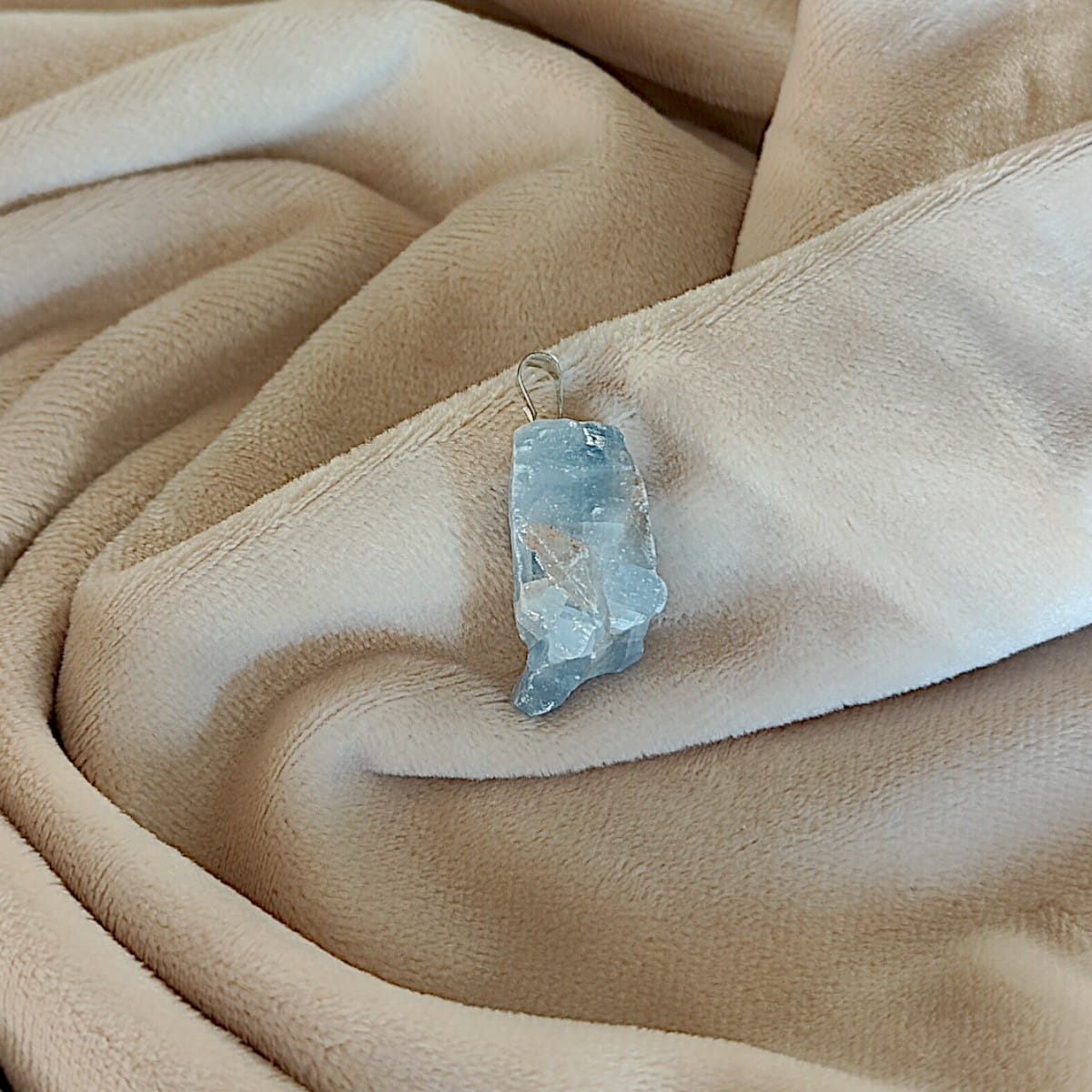 Surowy wisiorek z naturalnego kalcytu niebieskiego – kamień spokoju, komunikacji i wewnętrznej harmonii.