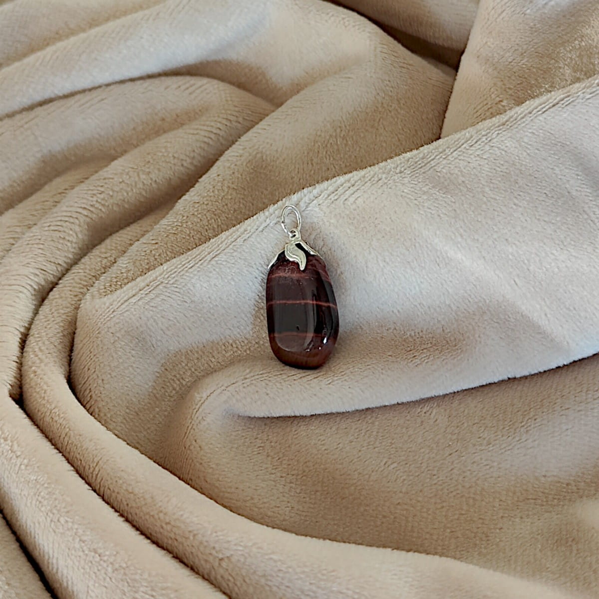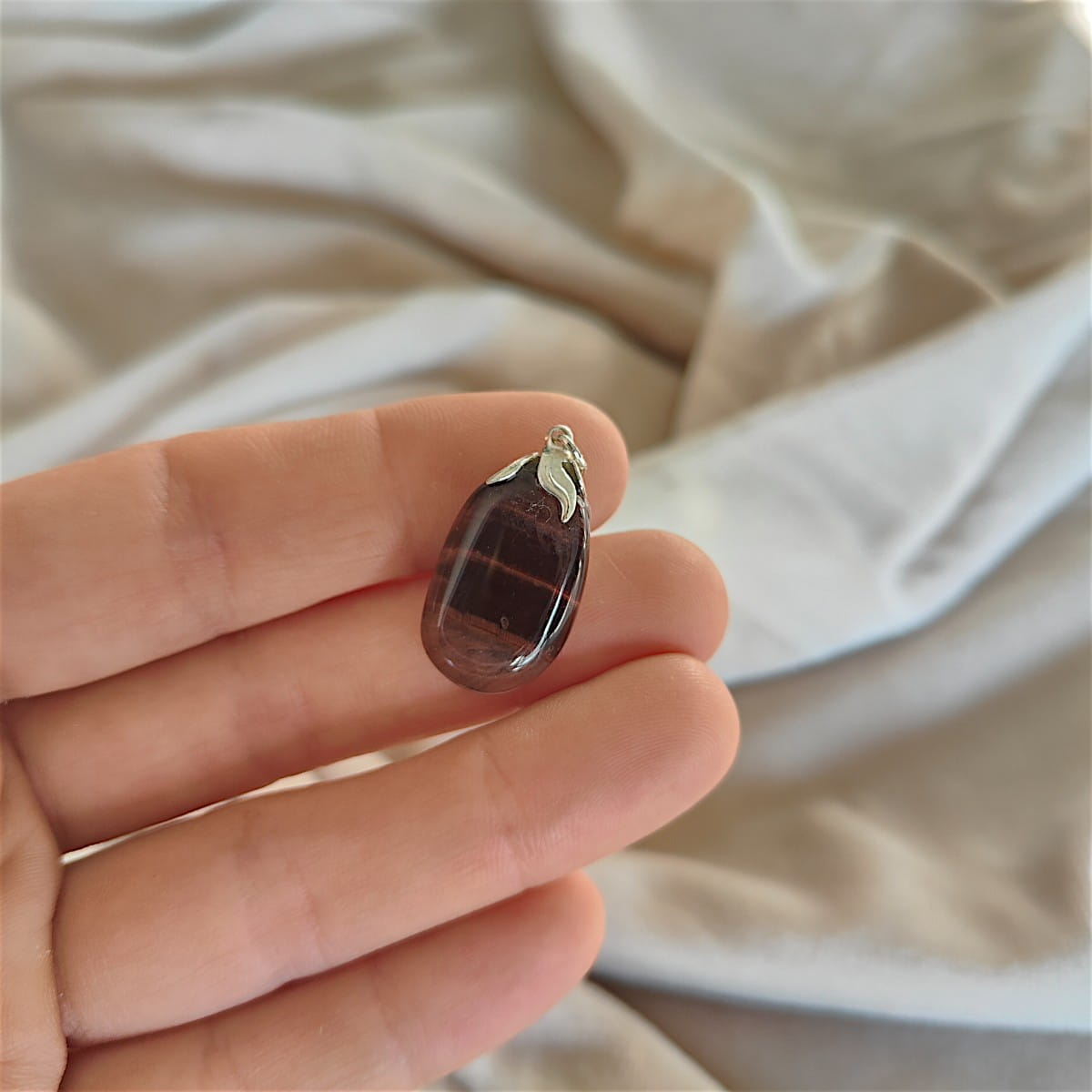 Wisiorek z naturalnego tygrysiego oka o wymiarach 1,5 x 3 cm, z mosiężnym oczkiem w srebrnym kolorze – kamień odwagi, ochrony i siły wewnętrznej.